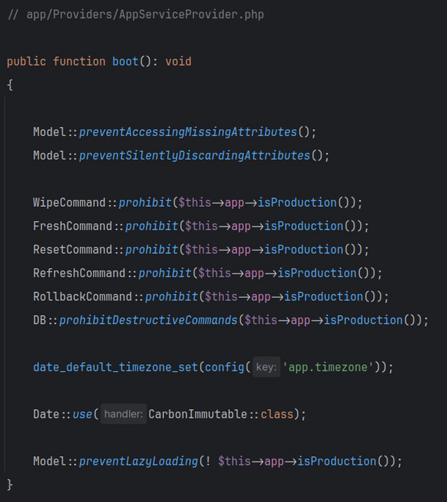 Here's my default boot method in the AppServiceProvider, these days - got any other suggestions?